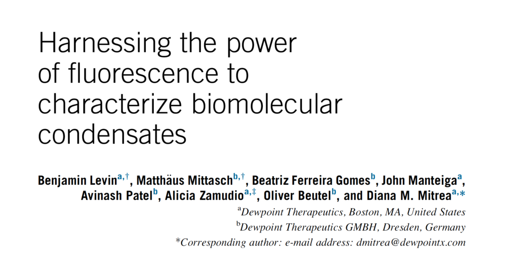A new article focused on fluorescence methods to characterize biomolecular condensates was published in Methods in Microbiology. The article, co-authored by Dewpoint scientists, adds to the growing body of work on condensate science.